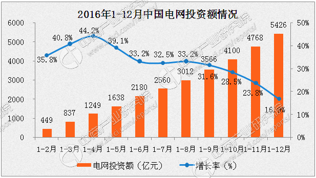 從電網(wǎng)投資來看,2016年1-12月,全國電網(wǎng)投資額達到5426億元,同比增長16.9%。從月度增長趨勢可見,全國電網(wǎng)投資的增速逐漸放緩。