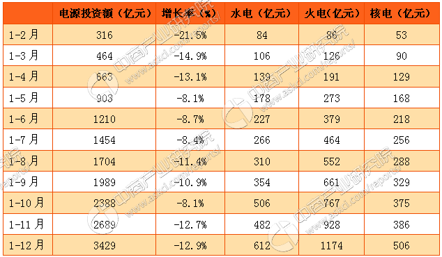 從電源投資來看,2016年1-12月,全國電源投資額達到3429億元,同比下降12.9%。其中,水電投資額為612億元,同比下降22.4%;火電投資額達到1174億元,同比增加0.9%;核電投資額為506億元,同比下降10.5%。