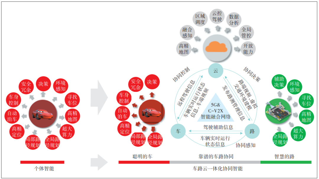 隨著車輛智能化水平的不斷提高,車載計(jì)算設(shè)備的算力逐漸難以滿足復(fù)雜路況下實(shí)時(shí)處理大量數(shù)據(jù)的需求,既是成本瓶頸,也是能力瓶頸。為解決這一問(wèn)題,行業(yè)研究出車路云一體化的技術(shù)演進(jìn)路線(見(jiàn)圖5)。此方案體系下,車輛通過(guò)高速穩(wěn)定的通信網(wǎng)絡(luò)與云端服務(wù)器、道路感知設(shè)備進(jìn)行實(shí)時(shí)數(shù)據(jù)交互。云端強(qiáng)大的計(jì)算能力既可對(duì)車輛上傳的大量傳感器數(shù)據(jù)進(jìn)行快速處理和分析,也可處理道路感知設(shè)備上報(bào)的實(shí)時(shí)道路信息和交通狀況。平臺(tái)綜合分析后將決策指令及時(shí)反饋給車輛,從而輔助車輛做出更精準(zhǔn)的決策。車路云一體化的技術(shù)方案可有效彌補(bǔ)車輛自身算力不足,進(jìn)一步提升智能網(wǎng)聯(lián)車輛的運(yùn)行效率和安全性,并為降低智能駕駛成本推動(dòng)智能網(wǎng)聯(lián)汽車快速普及,助力智能交通發(fā)展提供堅(jiān)實(shí)基礎(chǔ)。