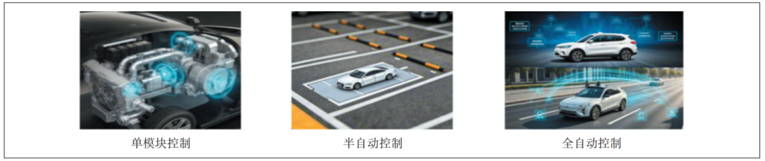智能網(wǎng)聯(lián)汽車的技術(shù)演進(jìn)歷程一般分為3個(gè)階段(見(jiàn)圖4)。第1階段是單模塊控制階段,車輛各個(gè)關(guān)鍵部件如動(dòng)力系統(tǒng)、制動(dòng)系統(tǒng)等都各自配備獨(dú)立的控制模塊,模塊之間協(xié)同性較差,只能實(shí)現(xiàn)基礎(chǔ)、相對(duì)簡(jiǎn)單的功能,例如簡(jiǎn)單的定速巡航,車輛無(wú)法自主應(yīng)對(duì)復(fù)雜路況;第2階段是半自動(dòng)控制階段,部分駕駛?cè)蝿?wù)可以由車輛自動(dòng)完成,例如記憶泊車功能,車輛能夠自動(dòng)識(shí)別停車位并精準(zhǔn)控制轉(zhuǎn)向、速度等完成泊車動(dòng)作,但仍需要駕駛員參與;第3階段是全自動(dòng)控制階段,車輛已達(dá)成真正意義上的高度智能化與自主化。車輛依托自身及周邊環(huán)境多傳感器融合技術(shù)構(gòu)建起全方位、高精度的環(huán)境感知體系,并基于云端智能網(wǎng)聯(lián)平臺(tái)的強(qiáng)大賦能,具備強(qiáng)大的駕駛決策能力,可實(shí)時(shí)調(diào)整行駛策略以應(yīng)對(duì)復(fù)雜多變交通場(chǎng)景,全程無(wú)需駕駛員任何干預(yù)。