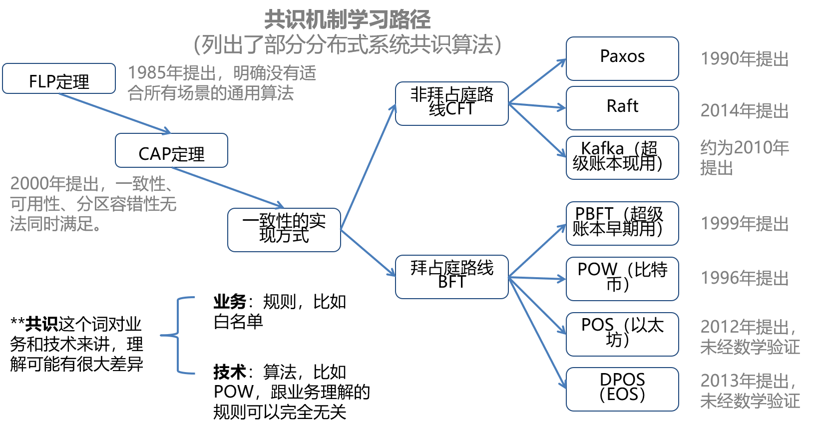 共識是區(qū)塊鏈中炒的很熱的概念,甚至?xí)尫羌夹g(shù)出身的同學(xué)覺得“共識”是區(qū)塊鏈發(fā)明的。我對共識了解不多,只是根據(jù)資料總結(jié)了一個(gè)共識的發(fā)展路徑或者說學(xué)習(xí)路徑供大家參考: