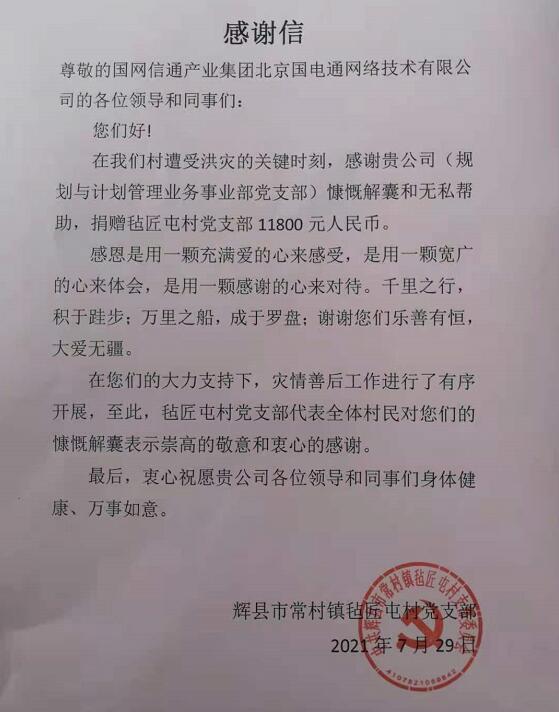 中國電力網(wǎng)訊 (通訊員 朱友宇) “在您們的大力支持下,災(zāi)情善后工作進(jìn)行了有序開展,至此,氈匠屯村黨支部代表全體村民對您們的慷慨解囊表示崇高的敬意和衷心的感謝”,輝縣市常村鎮(zhèn)氈匠屯村黨支部在感謝信中寫道。7月29日,國網(wǎng)信通產(chǎn)業(yè)集團(tuán)國電通規(guī)劃與計劃管理業(yè)務(wù)事業(yè)部黨支部收到了一封特殊的感謝信,這封信不是來自用戶的,也不是來自上級單位的,它來自輝縣市常村鎮(zhèn)氈匠屯村黨支部。