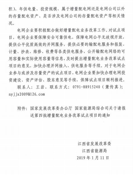 江西省發(fā)改委、江西省能源局日前聯(lián)合發(fā)布了《關(guān)于報(bào)送第四批增量配電業(yè)務(wù)改革試點(diǎn)項(xiàng)目的通知》,要求各地要結(jié)合工作實(shí)際情況,認(rèn)真總結(jié)前三批試點(diǎn)經(jīng)驗(yàn),按照國(guó)家相關(guān)要求盡快篩選符合條件的第四批試點(diǎn)項(xiàng)目,試點(diǎn)項(xiàng)目應(yīng)符合省級(jí)電網(wǎng)規(guī)劃。強(qiáng)調(diào)電網(wǎng)企業(yè)要積極配合做好增量配電業(yè)務(wù)改革工作。對(duì)試點(diǎn)項(xiàng)目,電網(wǎng)企業(yè)要保障安全可靠供電,保障電網(wǎng)公平無歧視開放, 提供公平優(yōu)質(zhì)高效的并網(wǎng)服務(wù),提供必要的輸配電服務(wù)和報(bào)裝、 計(jì)量、抄表、維修、收費(fèi)等各類供電服務(wù),公開輸配電網(wǎng)絡(luò)的可 用容量和實(shí)際使用容量等信息,及時(shí)提出增量配電業(yè)務(wù)改革試點(diǎn)項(xiàng)目的意見,加快辦理并網(wǎng)接入、供電服務(wù)等手續(xù)。