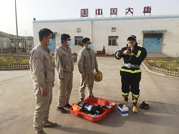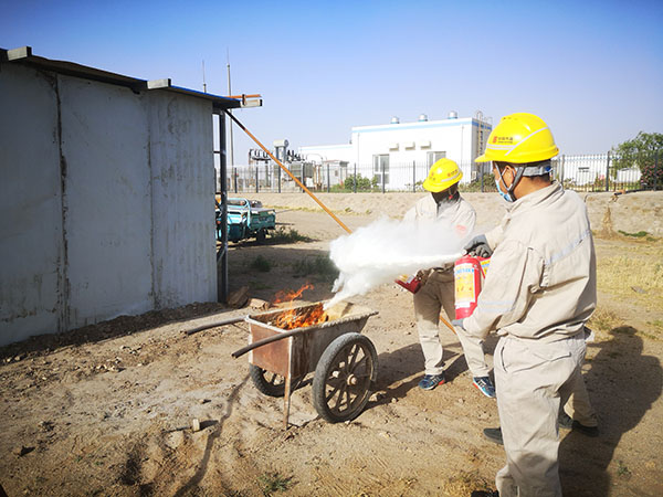 首先開展的是干粉滅火器實(shí)操演練。運(yùn)維人員取出4具即將送檢的滅火器,用小推車裝好干柴放置在空曠地點(diǎn),駐站人員講解了滅火器檢查方法和使用流程后,在確保安全的情況下將小推車內(nèi)的干柴點(diǎn)燃。一名工作人員用滅火器將車內(nèi)的火焰撲滅,再重新點(diǎn)燃,下一名人員繼續(xù)操作,最終達(dá)到參訓(xùn)人員全部能夠熟練使用滅火器的目的;其次,開展正壓呼吸器使用實(shí)操演練。在每個人都熟練掌握說明書上使用步驟和注意事項(xiàng)后,每名工作人員都穿戴正壓呼吸器一次,如果穿戴流程錯誤立即糾正并重新穿戴;再次,開展消防戰(zhàn)斗服穿戴實(shí)操演練。有火電消防工作經(jīng)驗(yàn)的人員對戰(zhàn)斗服使用步驟進(jìn)行詳細(xì)講解,每名工作人員都穿戴消防戰(zhàn)斗服一次,達(dá)到全員均能熟練穿戴的目的;最后,所有參訓(xùn)人員都組裝并佩戴防毒面具一次。