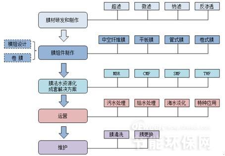 膜法水處理產(chǎn)業(yè)鏈由膜材料研發(fā)和制作、膜組件制作、膜法水資源化成套解決方案、運(yùn)營和維護(hù)組成。其中膜法水資源化整體解決方案又涵蓋了工藝方案、投標(biāo)、詳細(xì)設(shè)計(jì)、系統(tǒng)集成、施工安裝、系統(tǒng)試車、技術(shù)支持和售后服務(wù)等流程。其中,膜材料/膜元件制作和研發(fā)在整條產(chǎn)業(yè)鏈中擁有更高的技術(shù)先進(jìn)性和盈利性。