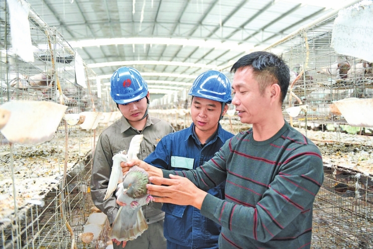 廣西新電力投資集團(tuán)博白縣公司工作人員了解鴿子養(yǎng)殖扶貧車(chē)間用電需求。向建軍 攝