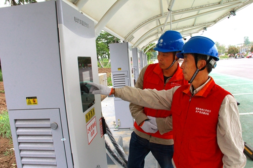 中國電力網訊 5月13日,江蘇連云港市東??h供電公司駝峰供電所服務人員趙孫華、何文軍在縣開發(fā)區(qū)花卉市場門前檢查電動汽車充電樁運行情況。
