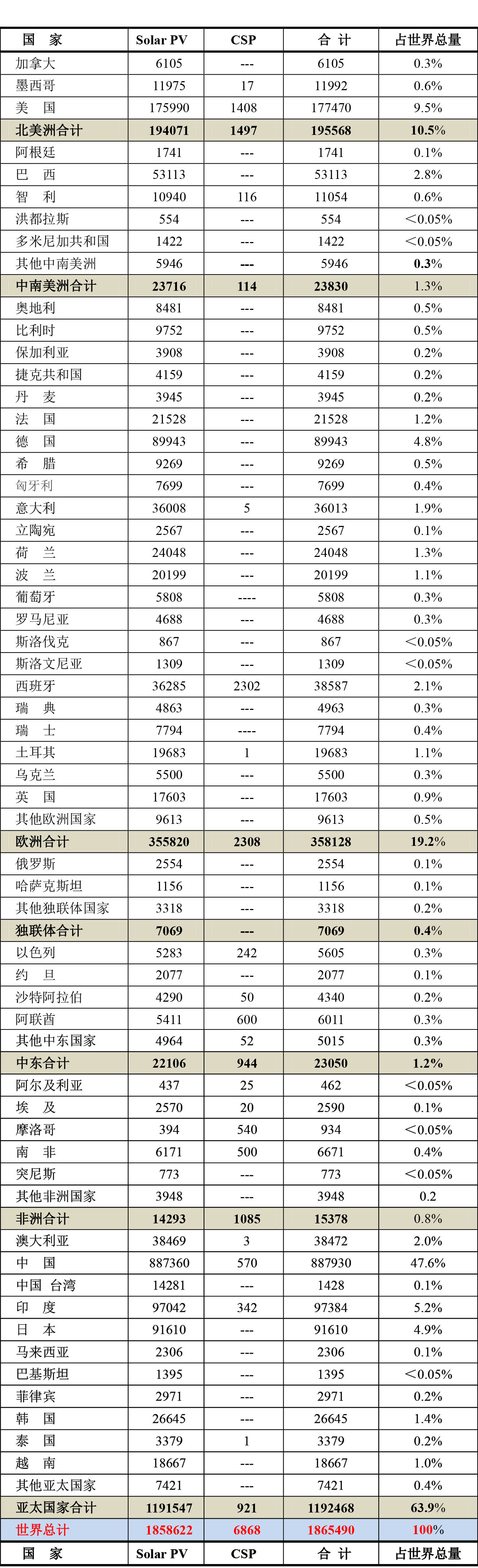 本文單位:MegaWatts, 即兆瓦。下表Solar PV為光伏發(fā)電,CSP為聚焦式太陽(yáng)能發(fā)電。