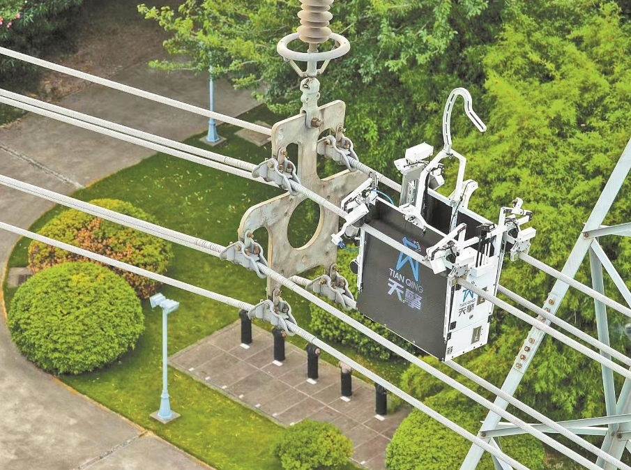 2022年,“天擎”機(jī)器人投用,集成基于深度學(xué)習(xí)的缺陷檢測算法和高精度視覺識別技術(shù),能夠準(zhǔn)確識別絕緣子串上的銷釘缺失等情況。依托“激光雷達(dá)+視覺SLAM多傳感器融合定位”技術(shù),“天擎”機(jī)器人能在百米高空中精準(zhǔn)定位隱患點(diǎn),識別直徑僅有4毫米的銷孔,完成銷釘抓取、穩(wěn)定對位、準(zhǔn)確插入等操作,用時(shí)不超過1分鐘。此外,“天擎”機(jī)器人有著基于超材料的抗電磁干擾外殼,能有效屏蔽特高壓強(qiáng)電磁場干擾,保障通信控制信號通暢。