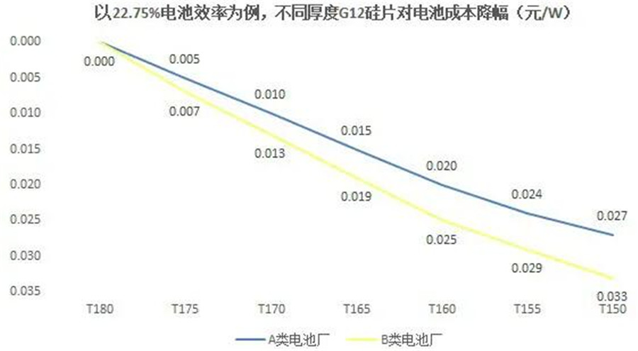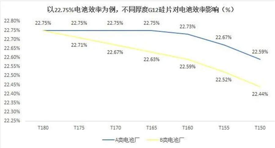 硅片減薄對(duì)效率有一定的影響,對(duì)此,中環(huán)股份提出測(cè)算。以22.75%電池效率為例,不同厚度G12硅片對(duì)電池效率影響是,A類電池廠商的生產(chǎn)條件下,應(yīng)用160μm硅片的電池的效率,比175μm的低0.02%。
