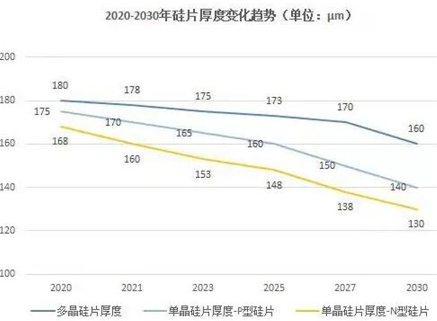 值得注意的是,N型電池對(duì)超薄硅片的適應(yīng)性更高。根據(jù)《路線圖》,用于異質(zhì)結(jié)的電池厚度可以降到150μm,用于MWT和IBC這兩種背接觸技術(shù)的電池可以降到130μm。