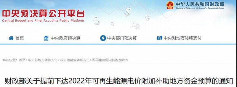 11 月 16日,中央預(yù)算公共平臺發(fā)布“關(guān)于提前下達(dá)2022年可再生能源電價(jià)附加補(bǔ)助地方資金預(yù)算的通知”。根據(jù)通知,本次下達(dá)總計(jì)新能源補(bǔ)貼資金38.7億元。其中,風(fēng)電15.5億元、光伏22.8億元、生物質(zhì)3824萬元。