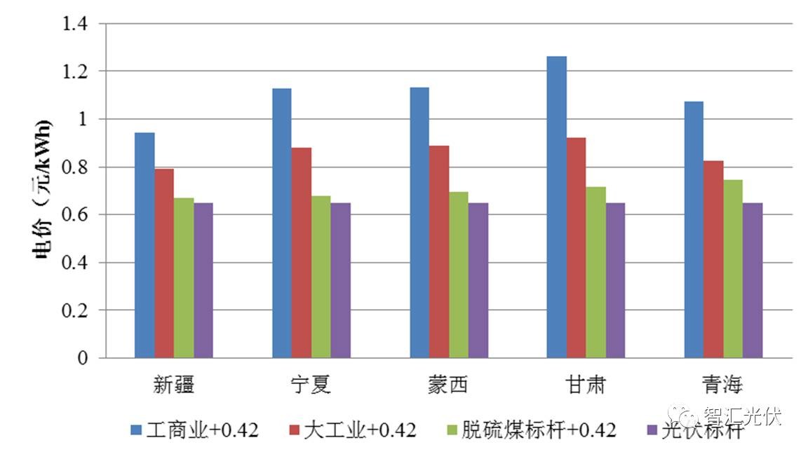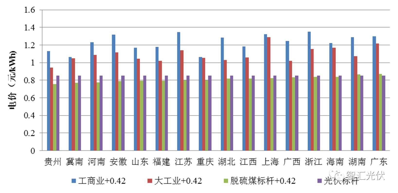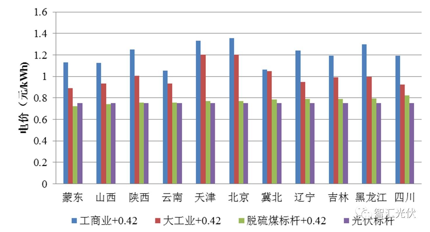 可以看出: “工商業(yè)+0.42”比0.65元/kWh高0.29~0.61元/kWh “大工業(yè)+0.42”比0.65元/kWh高0.14~0.27元/kWh 脫硫煤+0.42”比0.65元/kWh高0.02~0.095元/kWh 即在Ⅰ 類資源區(qū),無論是在工商業(yè)屋頂,還是大工業(yè)屋頂,“自發(fā)自用電價”、“余電上網(wǎng)電價“均高于當?shù)氐摹叭~上網(wǎng)”標桿電價0.65元/kWh。