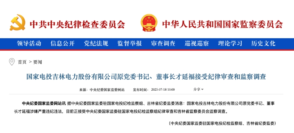 中央紀委國家監(jiān)委網(wǎng)站7月18日消息,據(jù)中央紀委國家監(jiān)委駐國家電投紀檢監(jiān)察組、吉林省紀委監(jiān)委消息:國家電投吉林電力股份有限公司原黨委書記、董事長才延福涉嫌嚴重違紀違法,目前正接受中央紀委國家監(jiān)委駐國家電投紀檢監(jiān)察組紀律審查和吉林省監(jiān)察委員會監(jiān)察調(diào)查。