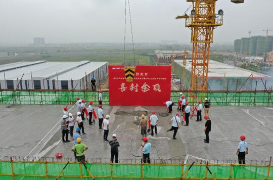 為了確保施工進度,總包方充分利用空閑時間,全員加班加點,在確保質量的同時與時間賽跑,最終如期完成生活服務中心及綜合樓中--九層辦公樓的土建工作,并于7月9日9時9分舉行了封頂儀式。