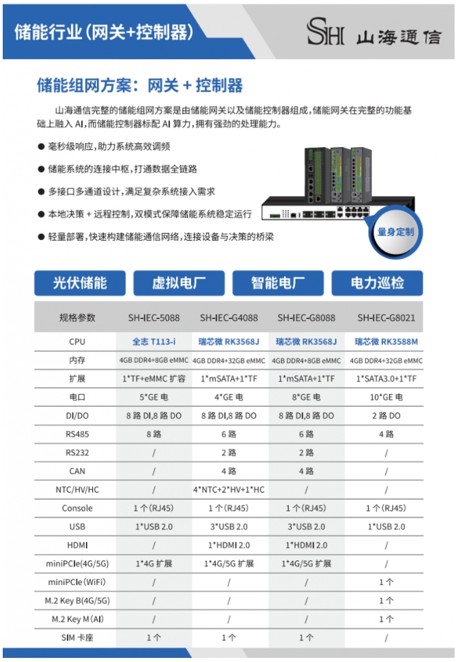 山海通信完整的儲能組網(wǎng)方案是由儲能網(wǎng)關(guān)以及儲能控制器組成,儲能網(wǎng)關(guān)在完整的功能基礎(chǔ)上融入 A,而儲能控制器標(biāo)配 AI算力,擁有強勁的處理能力。