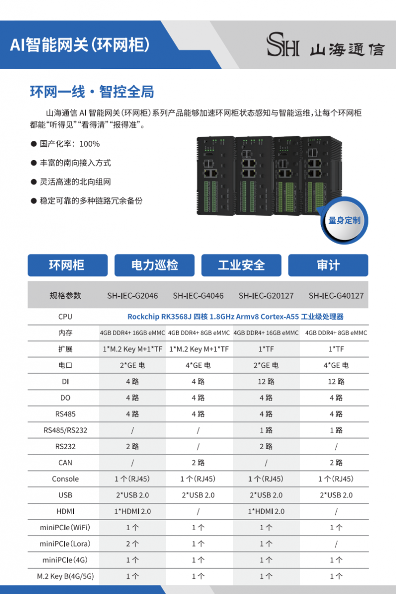 山海通信 AI智能網(wǎng)關(guān)(環(huán)網(wǎng)柜)系列產(chǎn)品能夠加速環(huán)網(wǎng)柜狀態(tài)感知與智能運維,讓每個環(huán)網(wǎng)柜都能“聽得見”“看得清”“報得準(zhǔn)”。
