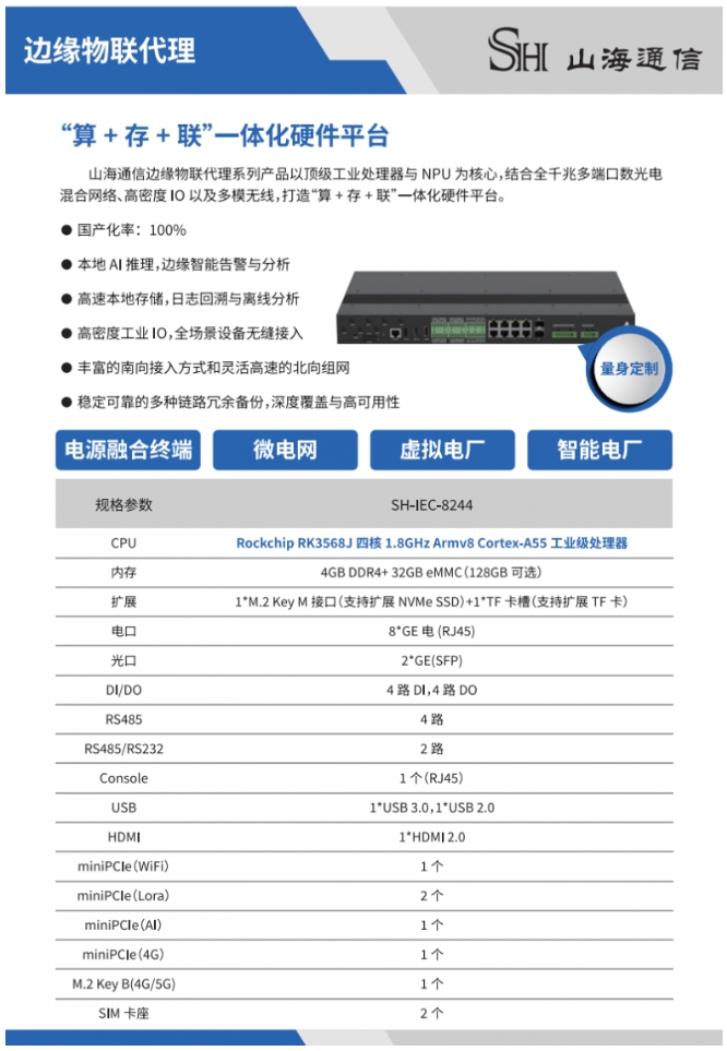 山海通信邊緣物聯(lián)代理系列產(chǎn)品以頂級工業(yè)處理器與 NPU為核心,結(jié)合全千兆多端口數(shù)光電混合網(wǎng)絡(luò)、高密度IO以及多模無線,打造“算+存+聯(lián)”一體化硬件平臺。
