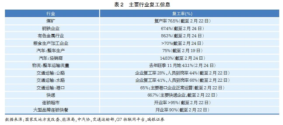 新冠疫情暴發(fā)以來,為防止疫情擴(kuò)散,除去武漢等13個(gè)城市封城以外,大多數(shù)省份選擇延遲復(fù)工復(fù)產(chǎn)、嚴(yán)格實(shí)施出行管控。雖然自2月以來,國內(nèi)政策重心已由防控疫情逐漸向企業(yè)復(fù)工傾斜,各地區(qū)開始分層分級推動(dòng)有序復(fù)工,但復(fù)工效率不及預(yù)期。由于地方隔離措施無法統(tǒng)一,返工人員明顯不足、交通物流依然不暢、產(chǎn)業(yè)鏈上下游尚未匹配、口罩等防疫物資持續(xù)不足,因此地區(qū)公布的企業(yè)復(fù)工數(shù)據(jù)僅代表企業(yè)獲得復(fù)工許可,產(chǎn)能實(shí)質(zhì)上未得到充分利用,“復(fù)工難復(fù)產(chǎn)”問題依然嚴(yán)峻。真正的全面復(fù)工可能需要到3月中下旬甚至更晚,而服務(wù)業(yè)的復(fù)工進(jìn)度更慢(注1)(見表1)。