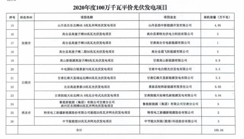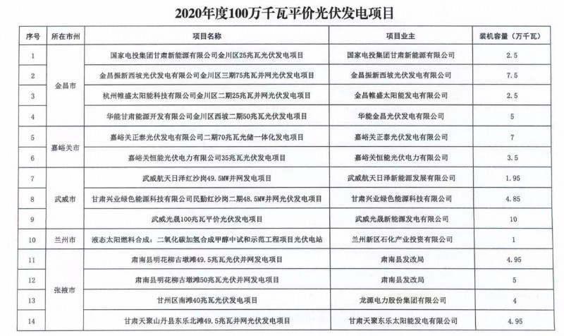 3月25日,甘肅省發(fā)改委發(fā)布《關(guān)于加快推進(jìn)全省新能源存量項(xiàng)目建設(shè)工作》的通知。文件明確,甘肅省目前新能源存量項(xiàng)目約600萬千瓦。其中,光伏發(fā)電項(xiàng)目1.23GW包括:酒湖直流工程配套23.5萬千瓦光伏發(fā)電項(xiàng)目以及《國(guó)家發(fā)展改革委辦公廳國(guó)家能源局綜合司關(guān)于公布2020年風(fēng)電、光伏發(fā)電平價(jià)上網(wǎng)項(xiàng)目的通知》(發(fā)改辦能源〔2020〕588號(hào))中尚未并網(wǎng)100萬千瓦光伏發(fā)電項(xiàng)目。