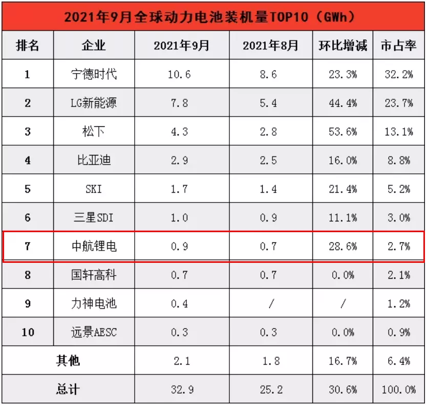 而從9月單月全球動(dòng)力電池裝車量排行榜來(lái)看,裝車量為0.9GWh、仍排名第七的中航鋰電,距離排名第六、裝車量為1GWh的韓國(guó)三星SDI僅差距0.1GWh。