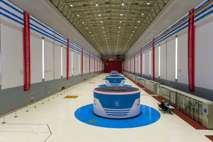 長龍山電站廠房內(nèi)共布置6臺(tái)35萬千瓦抽水蓄能機(jī)組,根據(jù)電網(wǎng)調(diào)度指令,在用電高峰期發(fā)電調(diào)峰,在用電低谷期抽水填谷,單臺(tái)機(jī)組每小時(shí)可抽水16萬立方米,假如6臺(tái)機(jī)組同抽,可以在8小時(shí)內(nèi)將上水庫從死水位抽至正常蓄水位,相當(dāng)于為“充電寶”充進(jìn)超過1260萬度電。假如在用電高峰期6臺(tái)機(jī)組齊發(fā),長龍山電站可持續(xù)6個(gè)小時(shí)滿發(fā),每個(gè)小時(shí)輸出電量210萬千瓦時(shí)。