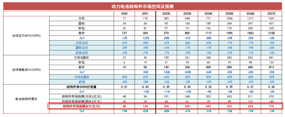 電池結(jié)構(gòu)件位于鋰電池行業(yè)上游,單GWh價值量與負極、隔膜電解液相當。受益于全球新能源汽車、儲能行業(yè)的高景氣度增長,方形、圓柱電池需求增長,袁健聰預計2025年全球電池結(jié)構(gòu)件行業(yè)市場空間約532億元,相比2022年市場空間翻倍,對應2022-2025年CAGR為31%。