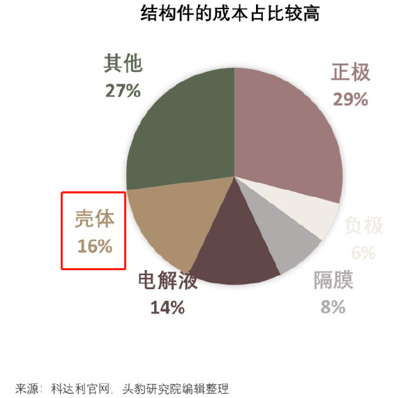 電池結(jié)構(gòu)件主要有圓柱形結(jié)構(gòu)件、方形結(jié)構(gòu)件和鋁塑膜三種類型,分別對應方形電池、圓柱電池、軟包電池。其中,圓柱形結(jié)構(gòu)件和方形結(jié)構(gòu)件又稱為硬殼結(jié)構(gòu)件,由殼體和蓋板組成。在鋰電池成本結(jié)構(gòu)中,結(jié)構(gòu)件成本占比達16%,僅次于正極。