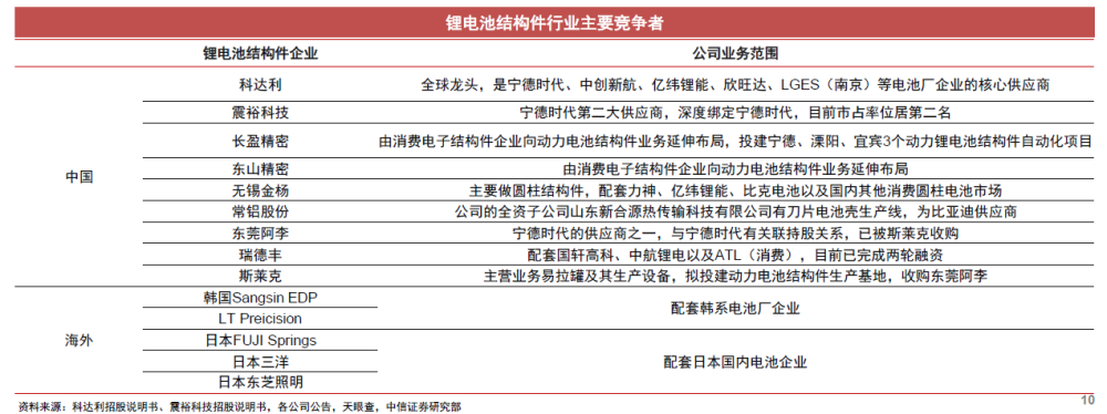 科達利為行業(yè)龍頭,最早布局動力電池結(jié)構(gòu)件業(yè)務,具備技術(shù)、產(chǎn)能規(guī)模優(yōu)勢,是下游大客戶寧德時代、LGES、中創(chuàng)新航等主流電池廠的核心供應商。行業(yè)龍二為震裕科技,是寧德時代的另一大核心供應商。此外還有長盈精密、東山精密、無錫金楊、常鋁股份、東莞阿李、瑞德豐、斯萊克等競爭者(如圖)。