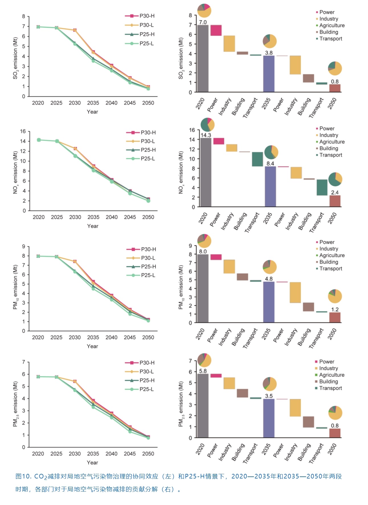 對(duì)比不同情景,在2025—2035年,上述4種局地污染物的排放在碳達(dá)峰時(shí)間不同的情景下會(huì)有明顯的不同。與P30情景相比,P25情景在2030年的SO2、NOx、PM10、PM2.5排放分別減少21%、12%、15%和14%。因此,盡管不同情景下2050年的排放趨于一致,盡早開始碳減排都將產(chǎn)生更多的近期收益。