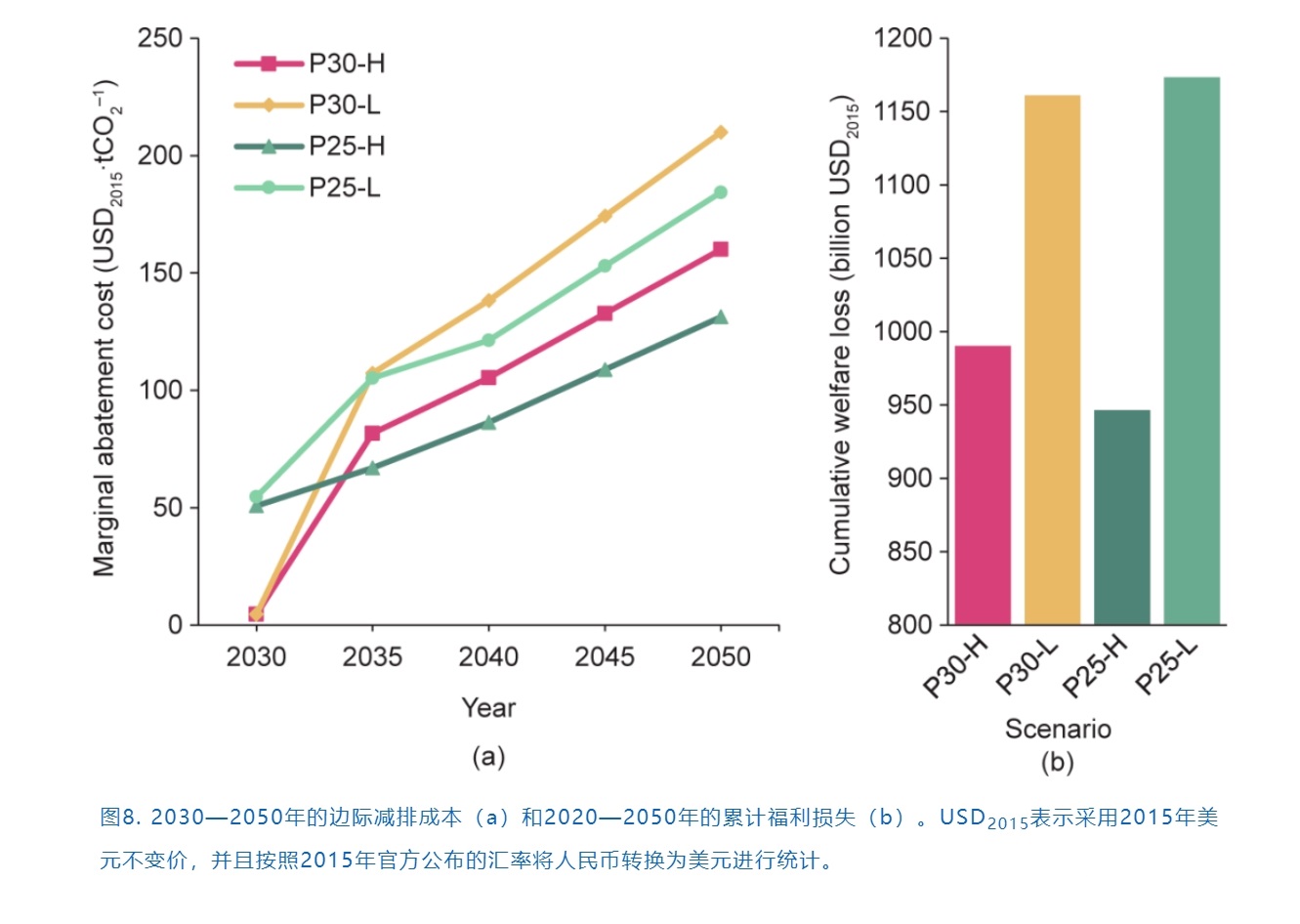 在P30情景下,在2030年實(shí)現(xiàn)國(guó)家自主貢獻(xiàn)目標(biāo)需要較小的努力[每噸二氧化碳(t CO2)花費(fèi)5 USD],然而遠(yuǎn)遠(yuǎn)未達(dá)到實(shí)現(xiàn)碳中和所需的努力。在P30-H情景下,2040年的MAC將增加到100 USD·t CO2-1以上;而對(duì)于P30-L,2035年的MAC就已經(jīng)超過100 USD·t CO2-1,到2050年將進(jìn)一步突破200 USD·t CO2-1。相比之下,由于P25在2030年已經(jīng)開始實(shí)現(xiàn)碳排放的下降,2030年的MAC約為50 USD·t CO2-1。與P30-L情景類似,P25-L情景也將在2035年達(dá)到100 USD·t CO2-1的MAC,但是后續(xù)的增長(zhǎng)將放緩,2050年的MAC為184 USD·t CO2-1。由于P25-H轉(zhuǎn)型壓力最小,2045年以前該情景的MAC都不會(huì)超過100 USD·t CO2-1,到2050年MAC也僅131 USD·t CO2-1。