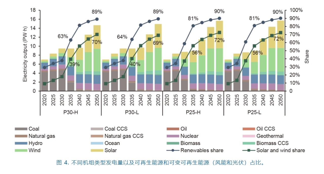 發(fā)電結(jié)構(gòu)的變化主要是因?yàn)槊弘姀S的退役和風(fēng)能及光伏發(fā)電的增加。可以預(yù)計(jì),煤電廠將很快進(jìn)入轉(zhuǎn)型最關(guān)鍵的10年。在此期間,煤電廠要么需要提前退役,要么將進(jìn)行靈活性改造以進(jìn)入輔助服務(wù)市場(chǎng),或者轉(zhuǎn)變?yōu)樯镔|(zhì)-煤混燃電廠甚至純BECCS電廠,從而能夠產(chǎn)生負(fù)排放。研究表明,碳達(dá)峰的時(shí)間在很大程度上取決于燃煤電廠退出發(fā)電序列的速度。比較P25和P30情景,發(fā)現(xiàn)近期需要盡快停止新建煤電廠并在合理范圍內(nèi)讓落后煤電廠有序退役。到燃煤電廠基本退出后,可再生能源發(fā)電量將占總發(fā)電量的81%,而以風(fēng)能和光伏為代表的可變可再生能源的比例將達(dá)到56%。對(duì)于P25情景,風(fēng)能和光伏的總裝機(jī)容量在2035年將達(dá)到3.1 TW,而對(duì)于P30情景,風(fēng)能和光伏在2040年的總裝機(jī)容量為3.4 TW。核能將成為電力系統(tǒng)的重要組成部分,未來可再生能源的滲透率會(huì)很高,其裝機(jī)容量將在未來20年增長(zhǎng)3倍以上。