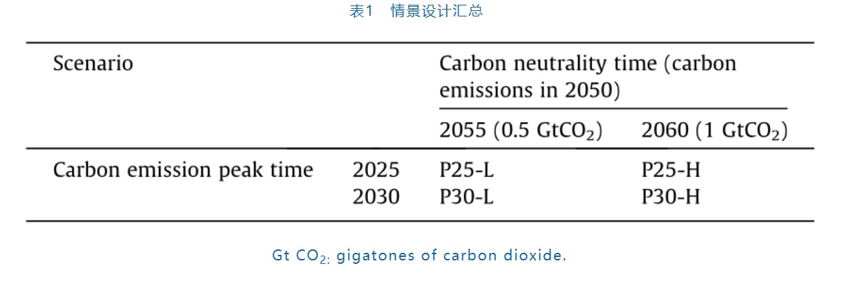 為了更加全面地評(píng)估能源轉(zhuǎn)型的影響,一些研究將研究邊界擴(kuò)大到整個(gè)能源系統(tǒng)。已有研究通過整合國(guó)家政策和技術(shù)發(fā)展預(yù)期,建立了自上而下的減排目標(biāo),并預(yù)測(cè)了不同政策下二氧化碳的排放量。目前也有一些研究評(píng)估了碳減排對(duì)空氣質(zhì)量、能源安全和水資源節(jié)約方面的協(xié)同效益。然而,這些研究都按照以往的2 ℃或1.5 ℃溫升控制目標(biāo)設(shè)計(jì)情景,并沒有以碳中和目標(biāo)為導(dǎo)向。