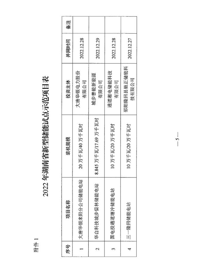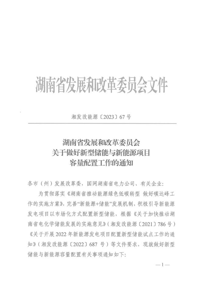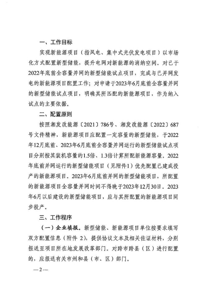 按照湖南發(fā)改委相關(guān)文件,新能源項目應配置一定容量的新型儲能,于2022年12月底前,2023年6月底前全容量并網(wǎng)運行的新型儲能試點項目分別按其裝機容量的1.5倍、1.3倍計算所配新能源容量。