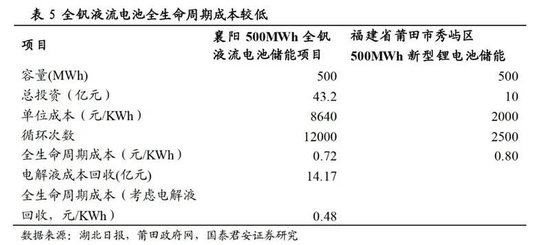 不過,釩電池儲(chǔ)能也有其劣勢(shì),除了當(dāng)下技術(shù)還不夠成熟之外,其初始投入也高于鋰電池等技術(shù)。國(guó)泰君安測(cè)算了襄陽(yáng)500MWh全釩液流電池儲(chǔ)能項(xiàng)目與莆田500MWh新型鋰電池儲(chǔ)能項(xiàng)目的投資回收情況,在容量規(guī)模相同的情況下,前者的總投資為43.2億元,而后者為10億元。