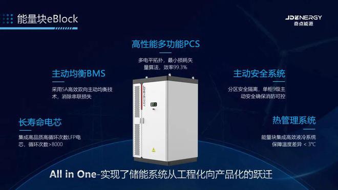 基于“all in one”的產(chǎn)品化設(shè)計(jì)理念,奇點(diǎn)能源能量塊eBlock創(chuàng)新性地將長壽命電芯、高效均衡BMS、高性能多功能PCS、主動安全系統(tǒng)、高效熱管理系統(tǒng)融于單個戶外布署機(jī)柜,形成了一體化的智慧能量塊產(chǎn)品eBlock,為電化學(xué)儲能行業(yè)提供了一種全新的解決方案。其真正做到了把儲能工程轉(zhuǎn)化為標(biāo)準(zhǔn)化產(chǎn)品,定義了儲能系統(tǒng)集成新標(biāo)準(zhǔn)。