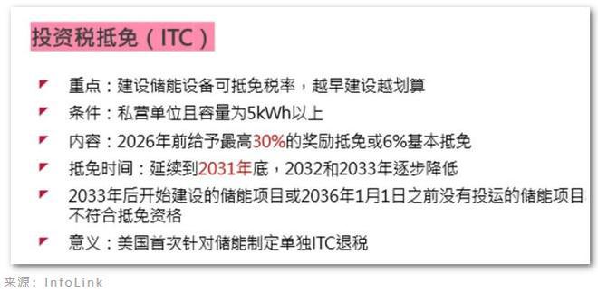 對(duì)于儲(chǔ)能來說,這是美國(guó)首次針對(duì)獨(dú)立儲(chǔ)能進(jìn)行投資稅抵免(Investment Tax Credit, ITC)。