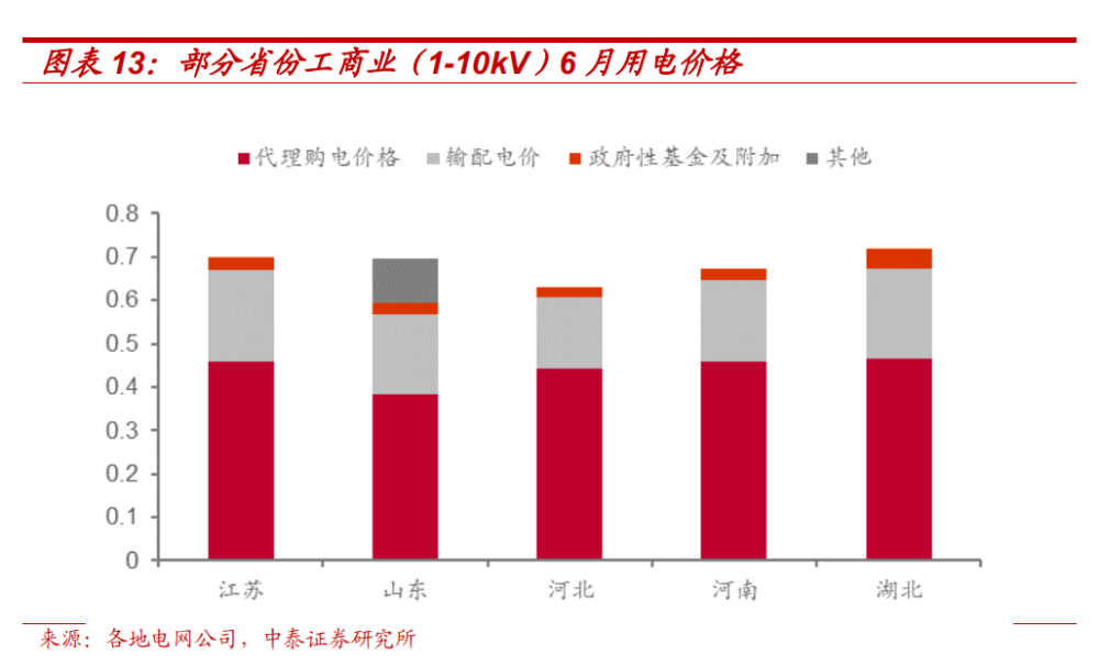 此前,關(guān)于儲(chǔ)能充電是否需承擔(dān)輸配電價(jià)等費(fèi)用,各地沒(méi)有明確統(tǒng)一的標(biāo)準(zhǔn)?!锻ㄖ诽貏e指出,獨(dú)立儲(chǔ)能電站向電網(wǎng)送電的,其相應(yīng)充電電量不承擔(dān)輸配電價(jià)和政府性基金及附加,這一規(guī)定將大幅降低儲(chǔ)能充電成本。我們統(tǒng)計(jì)了部分省份2022年6月代理購(gòu)電的用電價(jià)格,輸配電價(jià)和政府性基金及附加合計(jì)占用電價(jià)格的比例超過(guò)30%,以江蘇省為例,代理購(gòu)電價(jià)格、輸配電價(jià)、政府性基金及附加分別為0.4594、0.2110、0.0294 元/kWh,輸配電價(jià)及政府性基金占用電價(jià)格比例為 34.35%。若儲(chǔ)能充電需支付這兩部分費(fèi)用,將大幅提高充電成本,因此這一規(guī)定將明確儲(chǔ)能項(xiàng)目邊界條件,保障儲(chǔ)能合理收益,提高儲(chǔ)能投資意愿。