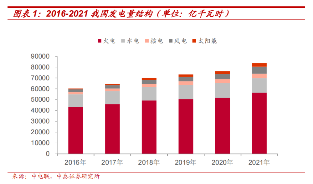 截至2021年,我國(guó)風(fēng)電裝機(jī)規(guī)模328.48GW,光伏裝機(jī)規(guī)模 306.56GW。2021年風(fēng)電發(fā)電量為6556億千瓦時(shí),占比7.83%,太陽(yáng)能發(fā)電量3270億千瓦時(shí),占比3.91%,發(fā)電量合計(jì)占比 11.74%,較2016年的5.10%提升6.64pct。