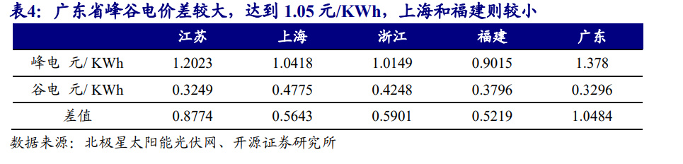 目前儲(chǔ)能站盈利模式的其中一類是采取峰谷電價(jià)套利模式,即儲(chǔ)能站在谷時(shí)充 電,峰時(shí)放電,以此補(bǔ)平電網(wǎng)負(fù)荷曲線的同時(shí)獲取峰谷電價(jià)差值的收益。 參考 2023 年各省電網(wǎng)企業(yè)代理購電價(jià)格來看,江蘇、上海、浙江、福建、廣東 等省為代表性較強(qiáng)的省份,選取谷時(shí)和高峰時(shí)段電價(jià)進(jìn)行比較,上海和福建的峰谷 電價(jià)差值較小,僅為 0.56 元、0.52 元/KWh,而廣東則價(jià)差較大,達(dá)到 1.05 元/KWh。