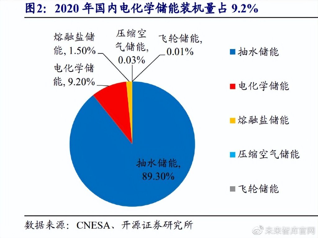從儲(chǔ)能方式來看,抽水儲(chǔ)能為目前國內(nèi)累計(jì)裝機(jī)規(guī)模最大的蓄能方式,占比達(dá) 到了 89.3%;其次是電化學(xué)儲(chǔ)能,裝機(jī)規(guī)模占比為 9.2%。熔融鹽儲(chǔ)熱裝機(jī)規(guī)模占比為1.5%;壓縮空氣儲(chǔ)能和飛輪儲(chǔ)能裝機(jī)規(guī)模占比都小于 0.1%。電化學(xué)儲(chǔ)能中,鋰電池仍 為主導(dǎo)儲(chǔ)能形式,占總量 88.8%,鉛蓄電池為第二大分支,占到 10.2%。