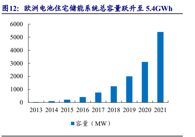 歐洲光伏產(chǎn)業(yè)協(xié)會(huì)(SolarPower Europe)數(shù)據(jù)表明,歐洲部署的住宅儲(chǔ)能系統(tǒng)總儲(chǔ)能容量在 2020 年首次突破 1GWh,而在 2021 年又增長了一倍多,達(dá)到 2.3GWh。 2021 年住宅電池儲(chǔ)能市場的規(guī)模是 2014 年的 35 倍。歐盟各國在 2014 年僅安裝了約 9000 套住宅電池儲(chǔ)能系統(tǒng),而到 2021 年,約部署了 26 萬套住宅電池儲(chǔ)能系統(tǒng)。歐 洲光伏產(chǎn)業(yè)協(xié)會(huì)在其“中等情景”預(yù)計(jì) 2022 年將達(dá)到 3.9GWh,將增長 71%,這將 使歐洲累計(jì)部署的住宅儲(chǔ)能系統(tǒng)總儲(chǔ)能容量達(dá)到 9.3GWh。根據(jù)該協(xié)會(huì)的預(yù)計(jì),歐洲 在 2022 年將安裝 42 萬多塊蓄電池,這將使歐洲 100 多萬戶家庭使用住宅太陽能發(fā) 電設(shè)施和住宅電池儲(chǔ)能系統(tǒng)。歐洲電池儲(chǔ)能系統(tǒng)的電池通常是進(jìn)口的,現(xiàn)在面臨著 嚴(yán)重短缺的困境。 歐洲光伏產(chǎn)業(yè)協(xié)會(huì)認(rèn)為,住宅太陽能和儲(chǔ)能系統(tǒng)的部署熱潮將會(huì)持續(xù)下去。根 據(jù)該協(xié)會(huì)對(duì)“中等情景”的預(yù)計(jì),到 2026 年底,歐洲將有 390 萬戶家庭部署住宅電 池儲(chǔ)能系統(tǒng),累計(jì)部署的儲(chǔ)能容量將增長 300%以上,達(dá)到 32.2GWh。而其“高等情 景”預(yù)測超過 44GWh。德國是在歐洲領(lǐng)先的住宅電池儲(chǔ)能市場 (2021 年占?xì)W洲住宅 電池儲(chǔ)能市場份額的 59%),新建的住宅太陽能設(shè)施的電池儲(chǔ)能系統(tǒng)配套部署率達(dá)到 70%,并且還在進(jìn)一步上升。