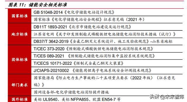 新標準對儲能安全標準提出更高要求。國家標準 GB/T 42288-2022《電化學儲 能電站安全規(guī)程》已正式發(fā)布,將于 2023 年 7 月 1 日起正式實施。此前儲能安全領 域的老國標系 2014 年發(fā)布,在消防領域主要規(guī)范了建筑物和設備防火等級、消防水 池和砂池的配置,探測和預警方面提出“應設置火災自動報警系統(tǒng)”和“宜配置感煙 探測器和可燃氣體報警裝置”。2021 年出臺的新國標征求意見稿,開始引入“自動滅 火系統(tǒng)”、“電池模塊級消防”、“多系統(tǒng)聯(lián)動”、“抑制復燃”等概念。此次新國標正式 發(fā)布,相較征求意見稿進一步趨嚴,新增了“每個電池模塊可單獨配置探測器”的表 述;“且防止復燃”的表述升級為“持續(xù)抑制復燃”。