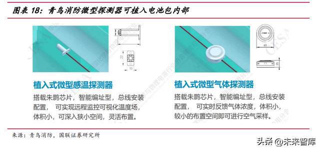 探測端的多層級要求將提升微型探測器的需求。多級防控設計落實到探測端,體 現(xiàn)在不僅在儲能預制艙中布設探測設備,更需要在每組電池簇,乃至每個電池模塊上, 布設氣體、溫度探測設備,以獲得對于隱患位置和發(fā)生時間更清晰的認識,從而進行 更及時精準的反應。