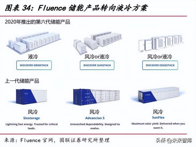 當前國內(nèi)儲能液冷滲透率較低,海外市場對液冷接受度較高。據(jù) GGII,2021 年 國內(nèi)儲能領域液冷溫控滲透率僅為 12%,預計 2025 年有望迅速提升至 45%。海外 市場缺乏統(tǒng)計數(shù)據(jù),但從全球系統(tǒng)集成龍頭 Fluence 的產(chǎn)品結構變化可以看出液冷 滲透率快速提升的趨勢。Fluence 在 2020 年以前的集成產(chǎn)品均為風冷方案,2020 年 后推出的新一代產(chǎn)品中,光伏配儲和工商業(yè)儲能產(chǎn)品提供風冷和液冷兩種選擇,電網(wǎng) 級儲能產(chǎn)品僅提供液冷配置。