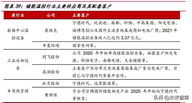 儲能溫控廠商多為相近賽道跨界而來,行業(yè)格局尚不穩(wěn)定。當前儲能溫控廠商主 要來自數(shù)據(jù)中心溫控、工業(yè)冷卻設備和車用熱管理領域,各自的先天優(yōu)勢有部分差異。 一般而言,數(shù)據(jù)中心溫控設備企業(yè)此前在風冷領域技術積累更多;工業(yè)冷卻設備企業(yè) 此前對于液冷技術的應用更多;而動力電池熱管理企業(yè)此前與電池廠商的綁定相對更 深入。目前儲能溫控市場空間相對較小,液冷方案在國內(nèi)剛剛起步,且行業(yè)具備較強 的定制化屬性,競爭格局尚不明確,需關注溫控廠商與頭部系統(tǒng)集成商的配套關系。