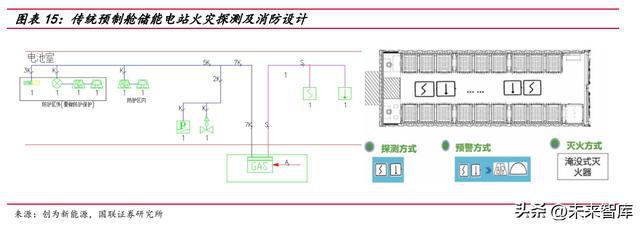 當前儲能系統(tǒng)火災探測及消防設計存在不足。目前預置艙儲能電站火災探測報 警系統(tǒng)參照 GB 50116《火災自動報警系統(tǒng)設計規(guī)范》,配置使用點型感溫和感煙探 測器,消防預警系統(tǒng)采用獨立的通訊方式,主要存在三點不足: 1)探測部分:配置的點型感溫和點型感煙探測器,只有在煙氣和溫度已經(jīng)蔓延 到艙室后才能起到報警作用,不適用于鋰離子電池熱失控早期預警,屬于電池熱擴散 事故發(fā)生后的火災報警。 2)火災抑制部分:在整個預制艙內(nèi)做淹沒式的滅火藥劑噴放,滅火藥劑無法作 用于發(fā)生熱失控的電池箱內(nèi)部,不能起到定向撲滅火災的作用。 3)聯(lián)動部分:傳統(tǒng)消防作為獨立運行的系統(tǒng),無法與 BMS 或 EMS 系統(tǒng)通訊形 成有效聯(lián)動。