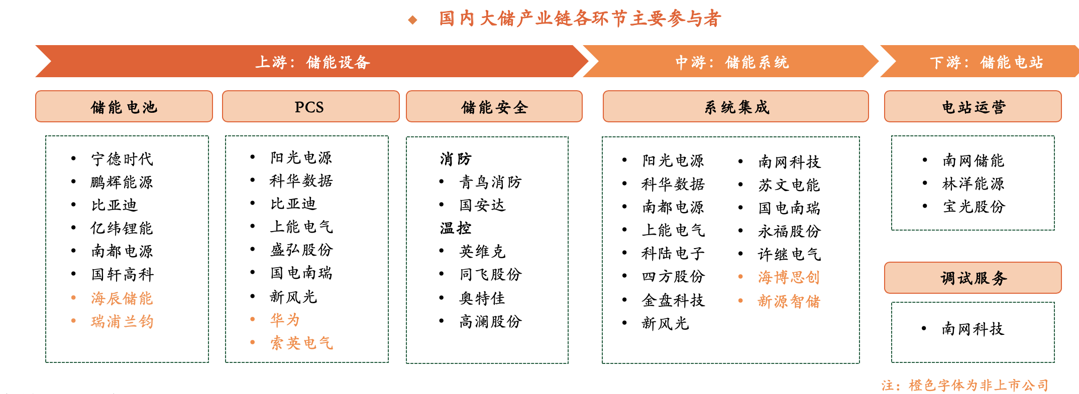 大儲產業(yè)鏈主要包括上游儲能設備、中游系統(tǒng)集成、下游電站等環(huán)節(jié)。儲能電池和PCS是大儲產業(yè)鏈價值量最大的兩個環(huán)節(jié),陳驍?shù)热苏J為,儲能電池絕對龍頭寧德時代,第二梯隊比亞迪、鵬輝能源、億緯鋰能、國軒高科、南都電源、海辰儲能等有望借國內大儲市場加速贏得動力電池之外的第二成長曲線。國內大儲PCS頭部企業(yè)陽光電源、科華數(shù)據(jù)、上能電氣、盛弘股份、國電南瑞、新風光等在裝機提速+毛利改善下業(yè)績有望受益。