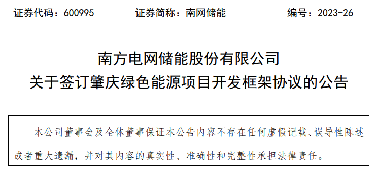 南網(wǎng)儲(chǔ)能于4月22日發(fā)布公告稱,南方電網(wǎng)儲(chǔ)能股份有限公司(乙方)于2023年4月21日與廣東省肇慶市發(fā)展和改革局(甲方)共同簽訂《肇慶綠色能源項(xiàng)目合作開發(fā)框架協(xié)議》。