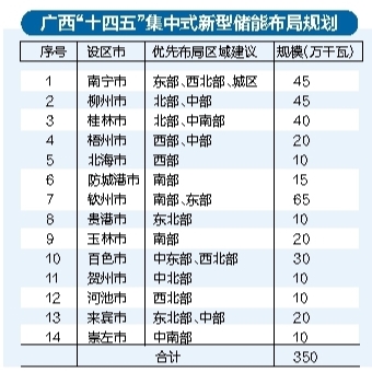 近日,自治區(qū)發(fā)展改革委印發(fā)《廣西新型儲(chǔ)能發(fā)展規(guī)劃(2023—2030年)》(以下簡(jiǎn)稱《規(guī)劃》)。從廣西“十四五”集中式新型儲(chǔ)能布局規(guī)劃(見(jiàn)下表)來(lái)看,欽州市將建設(shè)65萬(wàn)千瓦新型儲(chǔ)能,居全區(qū)第一;南寧優(yōu)先在東部、西北部、城區(qū)布局,建設(shè)45萬(wàn)千瓦新型儲(chǔ)能,建設(shè)規(guī)模和柳州持平,均居全區(qū)第二。